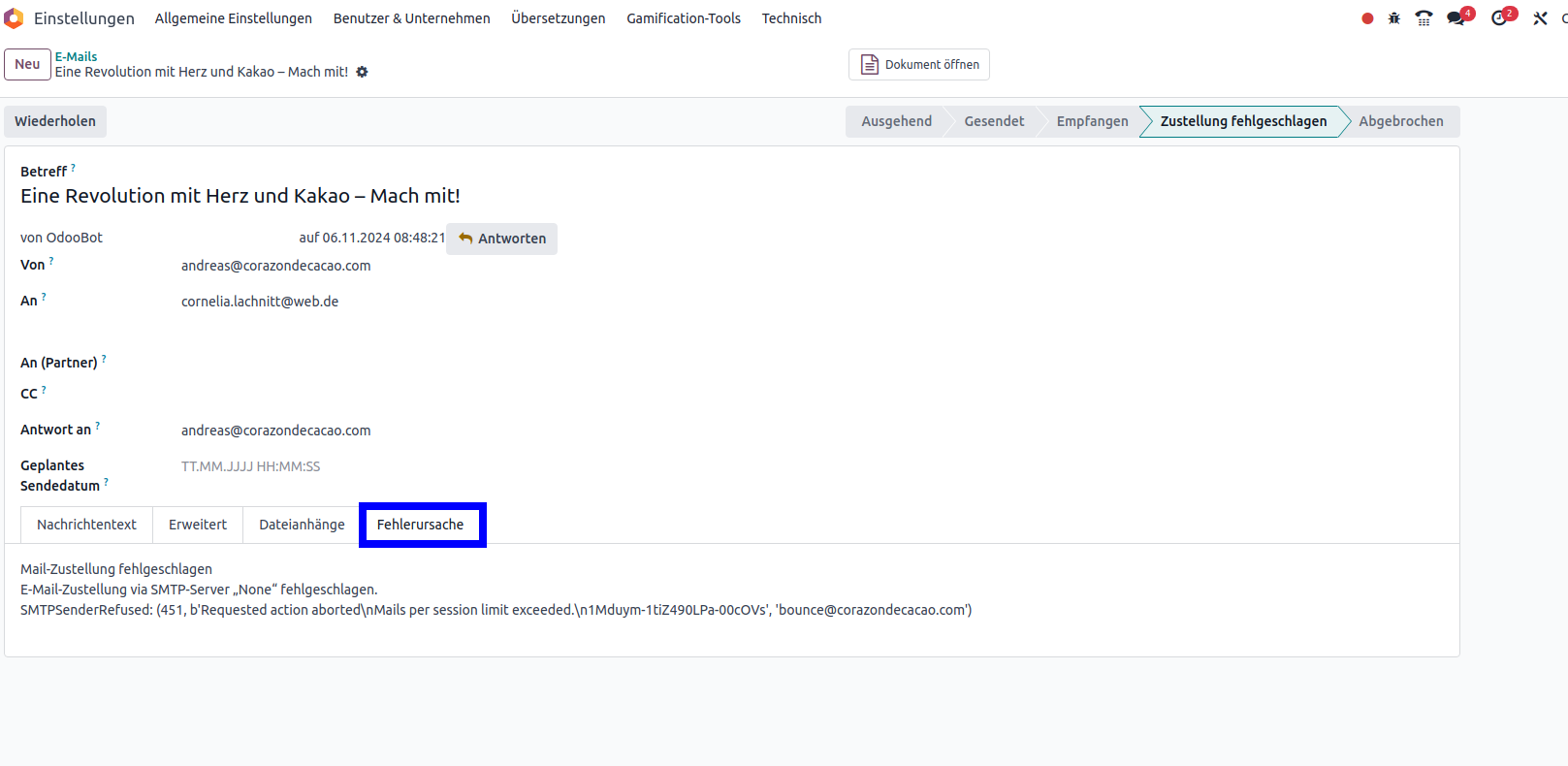 Hello, Thank you for contacting Odoo support. I would be happy to assist you in this matter. From what I am able to see the reason your mailings are failing are due to a session limit [...] ͏ ͏ ͏ ͏ ͏ ͏ ͏ ͏ ͏ ͏ ͏ ͏ ͏ ͏ ͏ ͏ ͏ ͏ ͏ ͏ ͏ ͏ ͏ ͏ ͏ ͏ ͏ ͏ ͏ ͏ ͏ ͏ ͏ ͏ ͏ ͏ ͏ ͏ ͏ ͏ ͏ ͏ ͏ ͏ ͏ ͏ ͏ ͏ ͏ ͏ ͏ ͏ ͏ ͏ ͏ ͏ ͏ ͏ ͏ ͏ ͏ ͏ ͏ ͏ ͏ ͏ ͏ ͏ ͏ ͏ ͏ ͏ ͏ ͏ ͏ ͏ ͏ ͏ ͏ ͏ ͏ ͏ ͏ ͏ ͏ ͏ ͏ ͏ ͏ ͏ ͏ ͏ ͏ ͏ ͏ ͏ ͏ ͏ ͏ ͏ ͏ ͏ ͏ ͏ ͏ ͏ ͏ ͏ ͏ ͏ ͏ ͏ ͏ ͏ ͏ ͏ ͏ ͏ ͏ ͏ ͏ ͏ ͏ ͏ ͏ ͏ ͏ ͏ ͏ ͏ ͏ ͏ ͏ ͏ ͏ ͏ ͏ ͏ ͏ ͏ Hello,